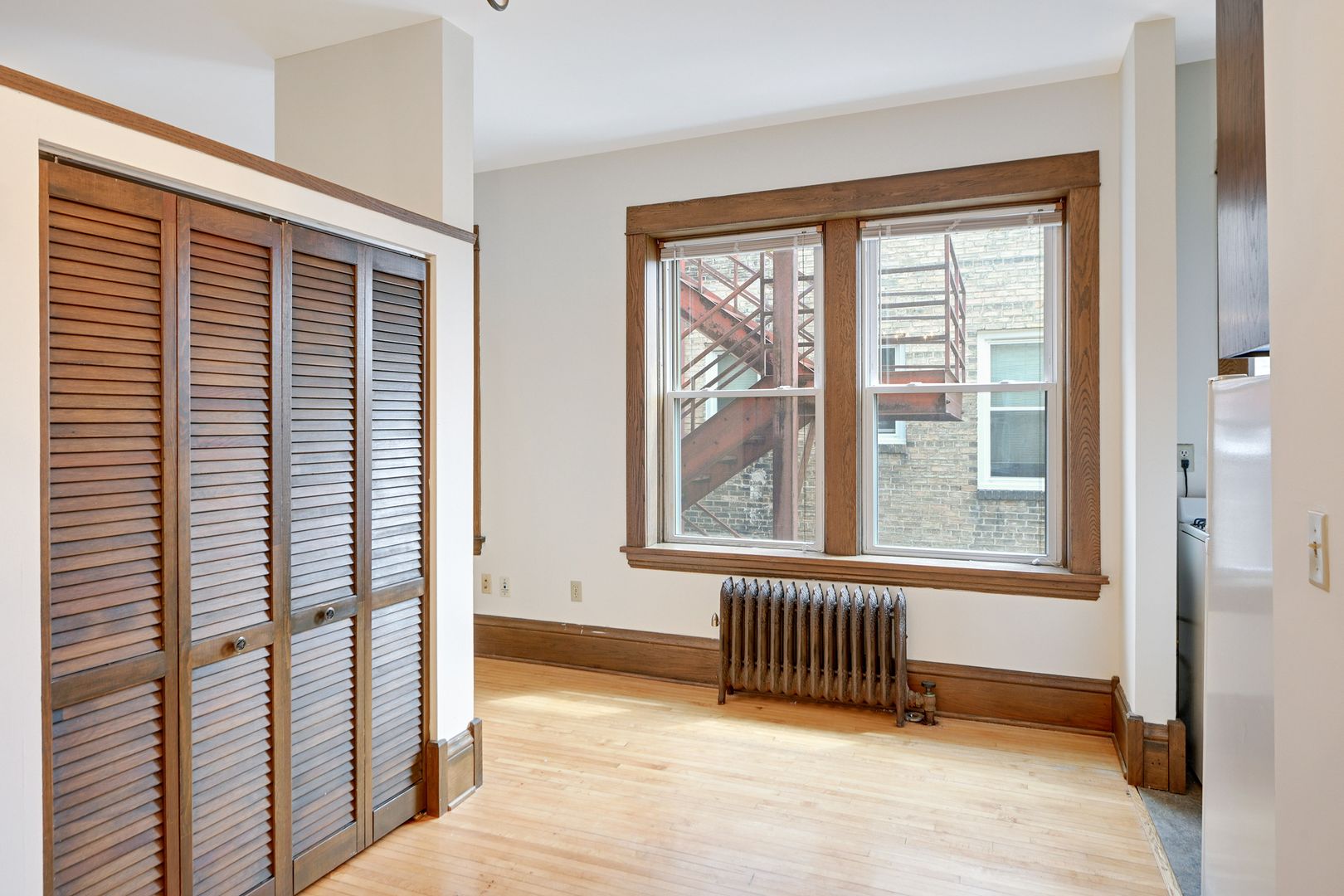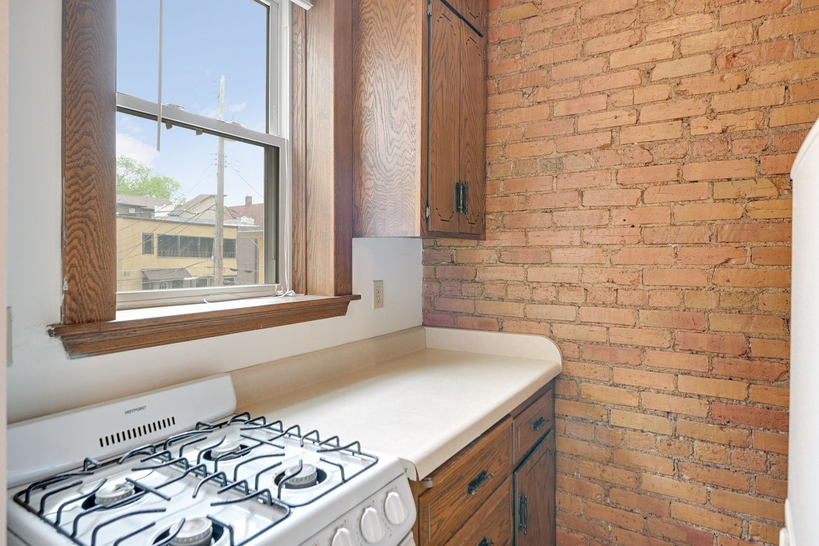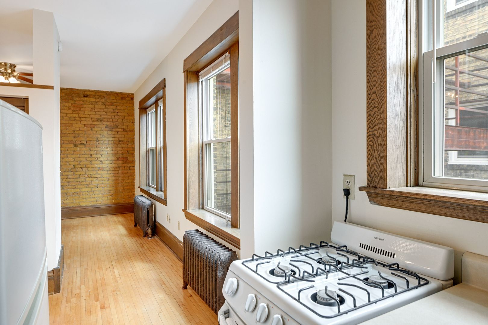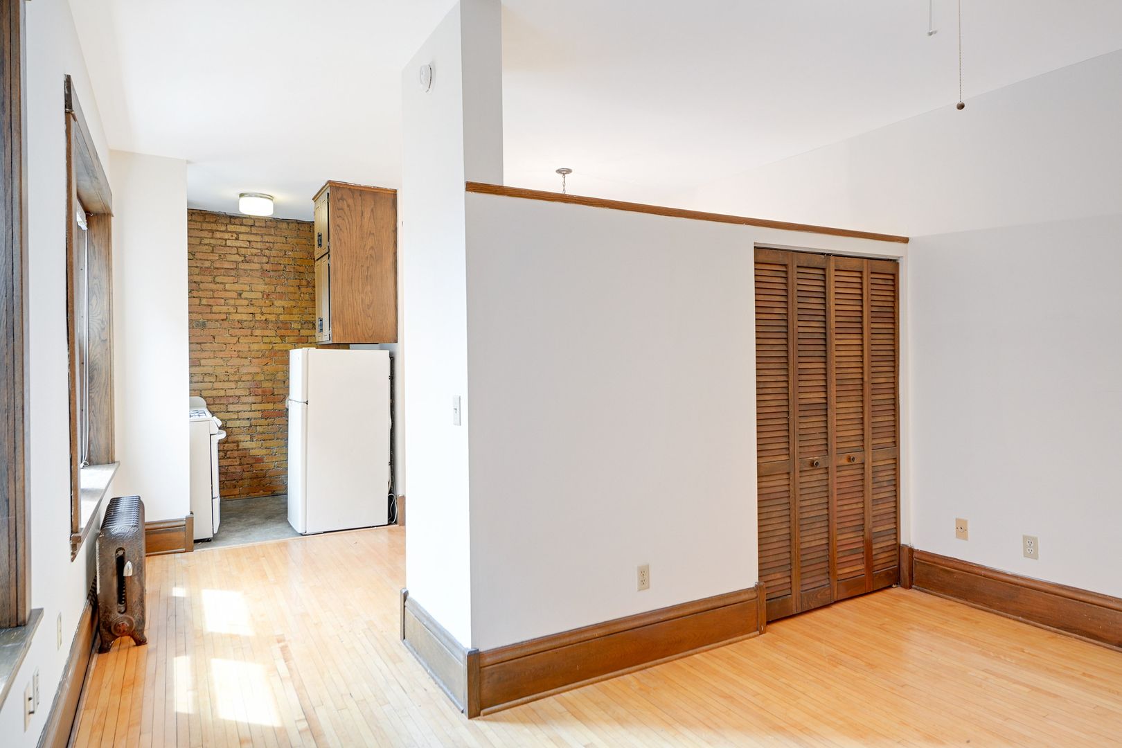 This first-floor studio apartment features exposed brick walls in both the kitchen and the living room area. It has two big closets and large windows that allow for lots of natural sunlight.