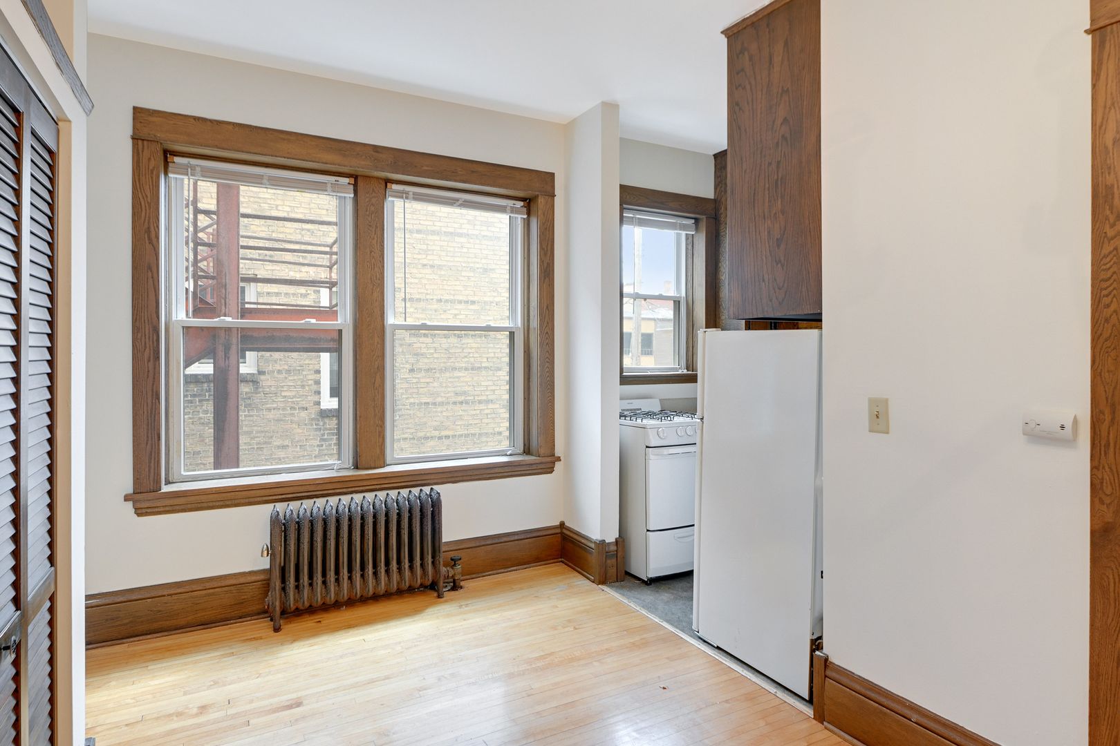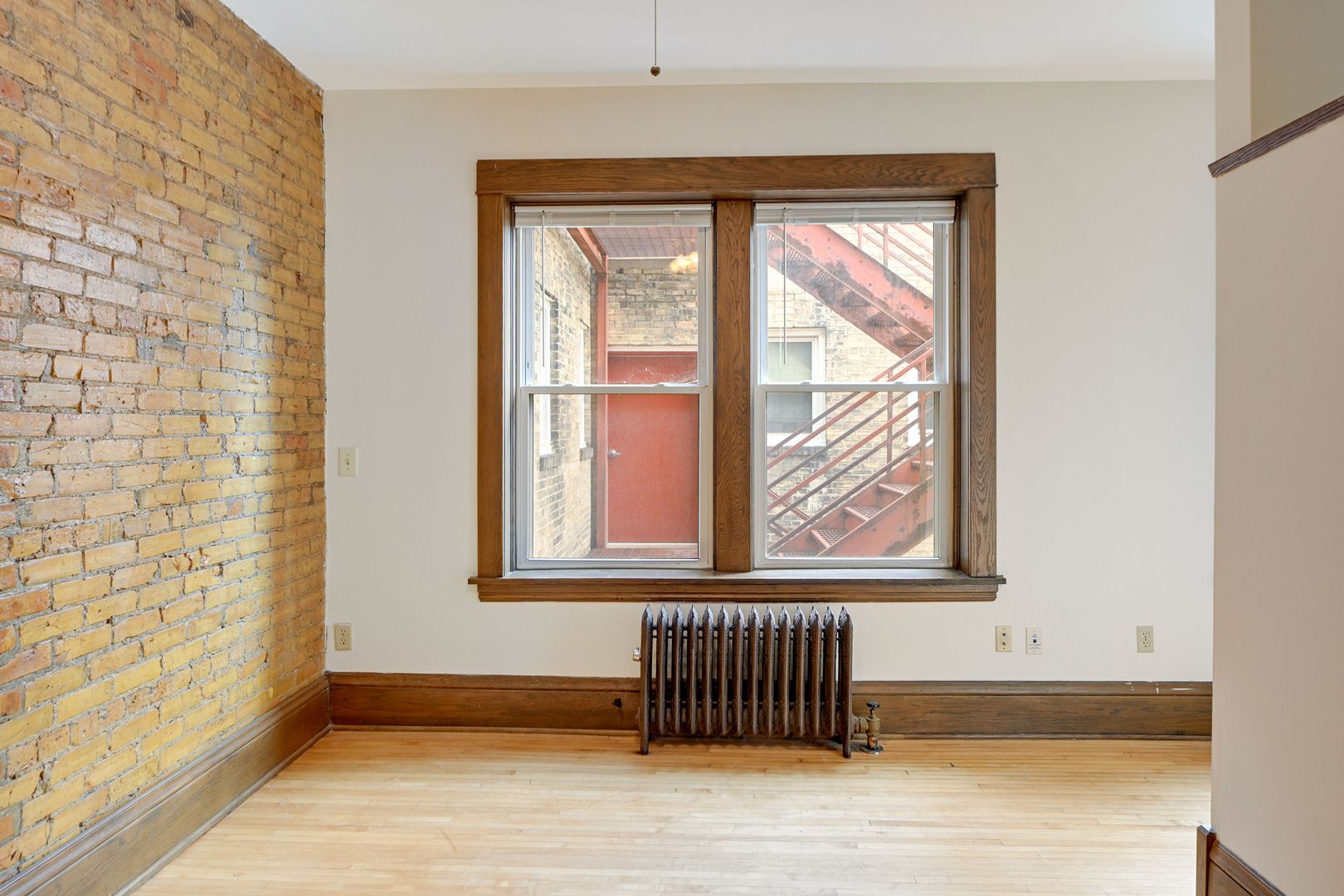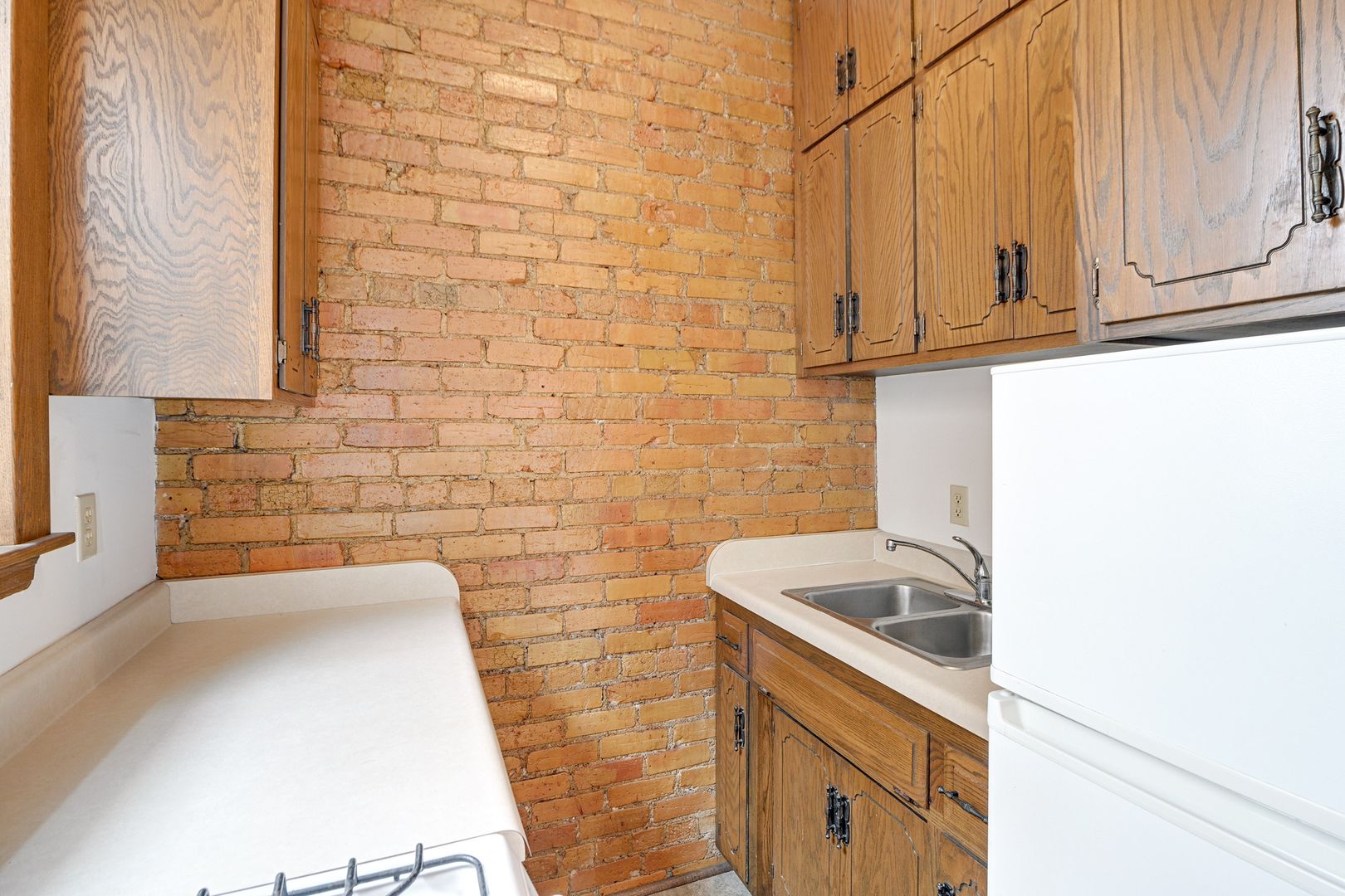 This first-floor studio apartment features exposed brick walls in both the kitchen and the living room area. It has two big closets and large windows that allow for lots of natural sunlight.