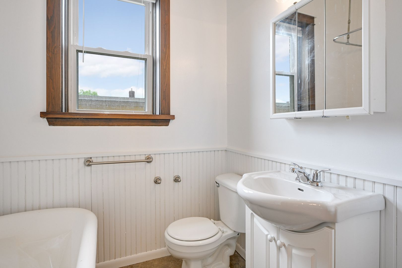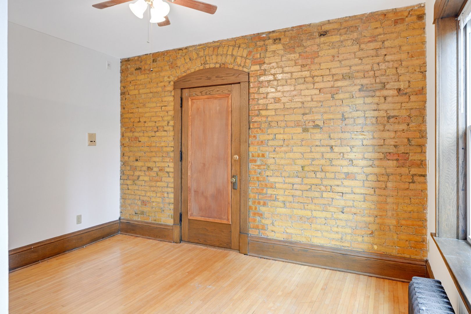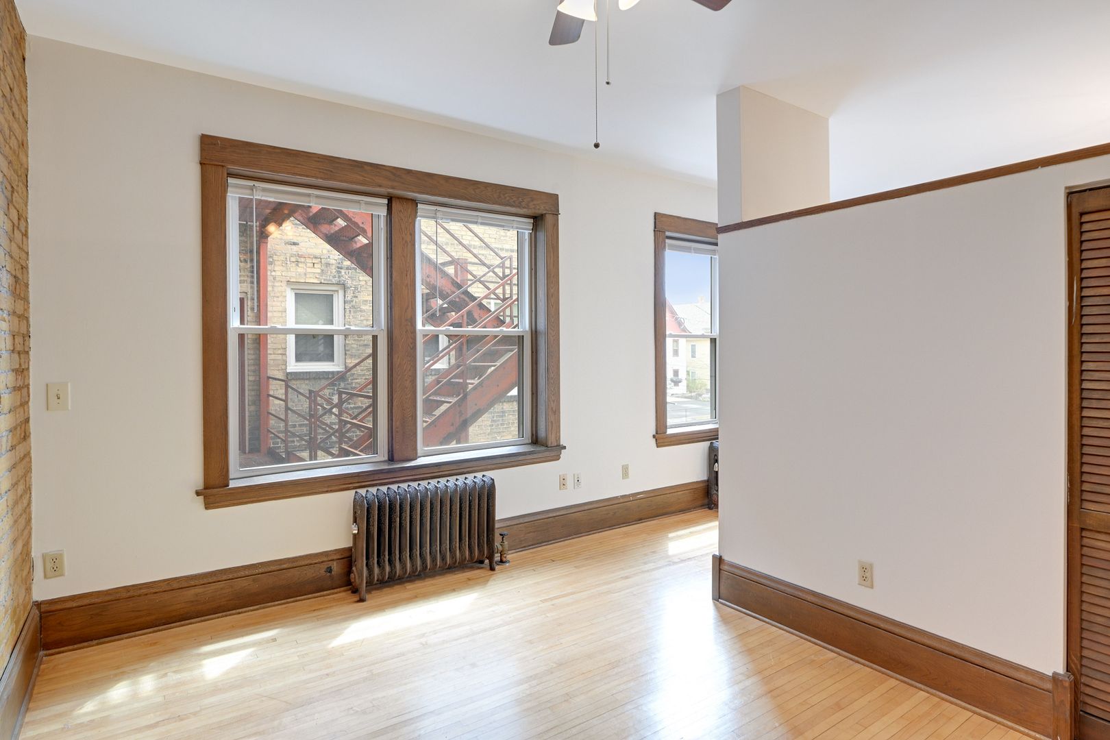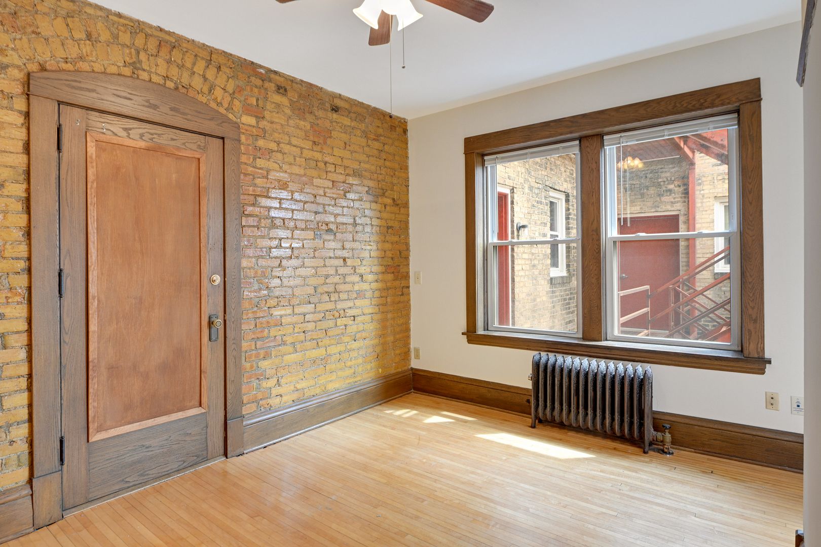 This first-floor studio apartment features exposed brick walls in both the kitchen and the living room area. It has two big closets and large windows that allow for lots of natural sunlight.